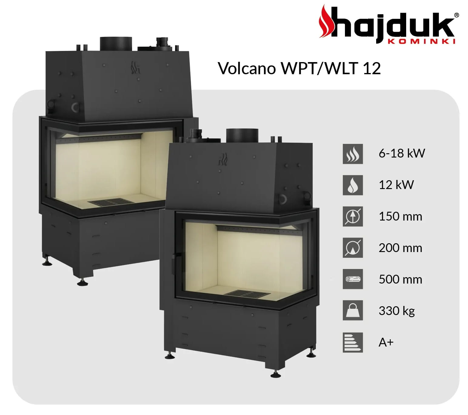Kominek z płaszczem wodnym Volcano WPT-12 to nowoczesny wkład kominkowy wodny narożny lewy, wyprodukowany przez producenta Hajduk.