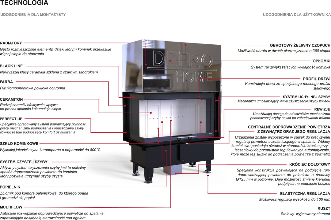 Ten niewielki ale wydajny kominek powietrzny może zostać wykorzystany jako główne źródło ciepła lub dodatkowe wsparcie dla systemu grzewczego z kotłem. Odpowiednio zaprojektowana instalacja kominka z płaszczem wodnym umożliwia rozprowadzać gorące powietrze do pozostałych pomieszczeń. Wkład pasuje do różnych rodzajów aranżacji, zapewniając komfort w każdym pomieszczeniu.
