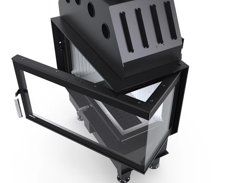 Wkład Intra S BP Mini wyposażono w system czystej szyby, regulację dopływu powietrza wtórnego i pierwotnego jednym suwakiem oraz system dopalania spalin. Atutem jest perforowana klamka, która się nie nagrzewa. Palenisko zostało wyłożone wytrzymałymi kształtkami z żarobetonu (ceramika+beton).