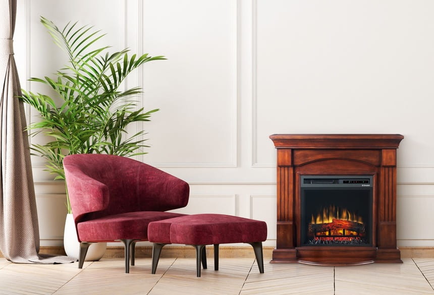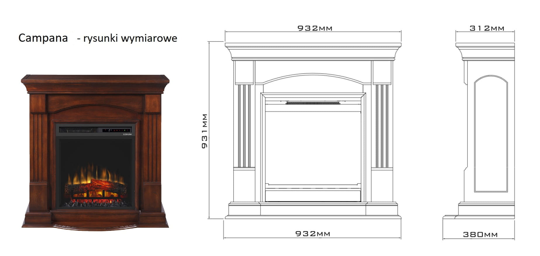 Campana to elegancki kominek elektryczny w klasycznej obudowie fornirowanej drewnem w kolorze orzecha, wyposażony w nowoczesną technologię ognia Optiflame®