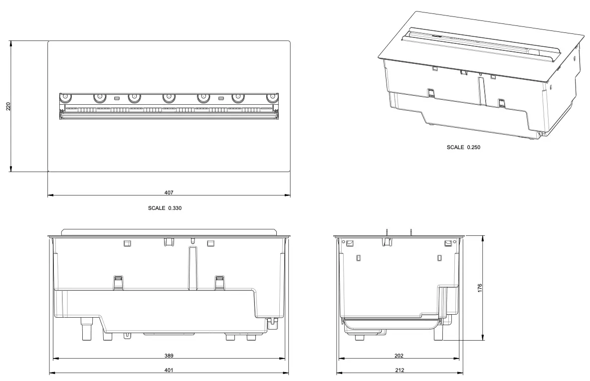 Kominek parowy Cassette 400 600 LED - schemat i wymiary