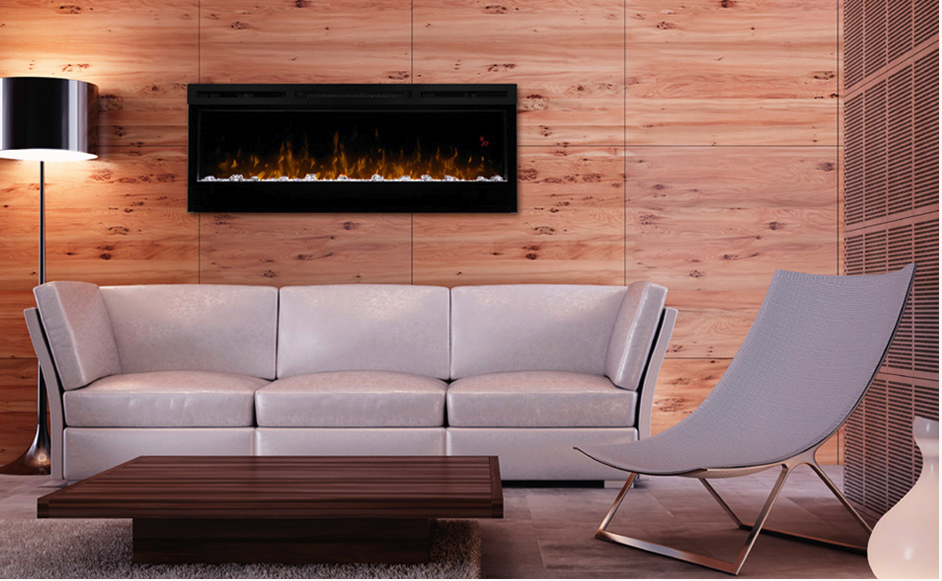 Panoramiczny kominek ścienny wyposażony w efekt świetlny Optiflame LED z opatentowynym systemem naśladującym bardzo realistycznie prawdziwe płomienie.