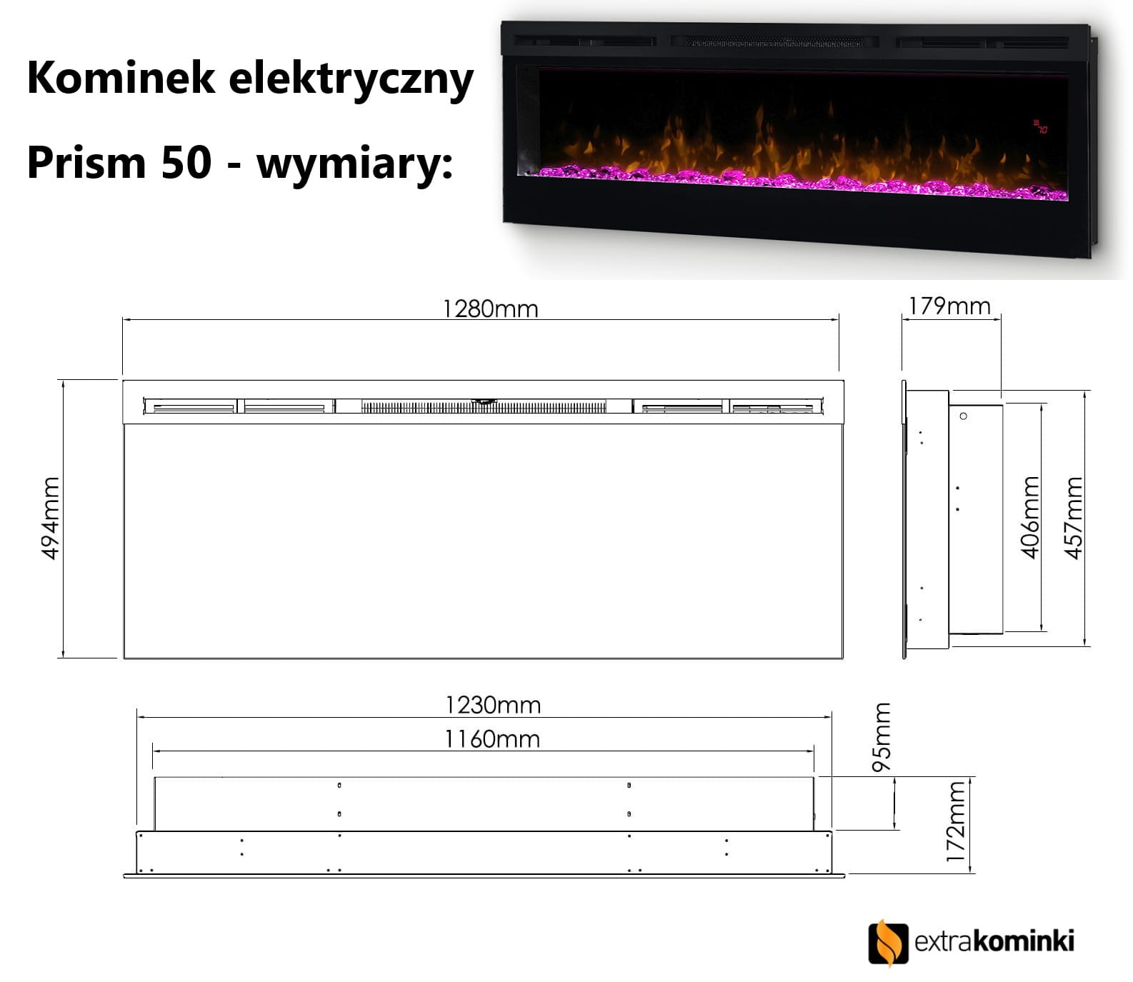 Rysunek wymiarowy kominka elektrycznego Prism