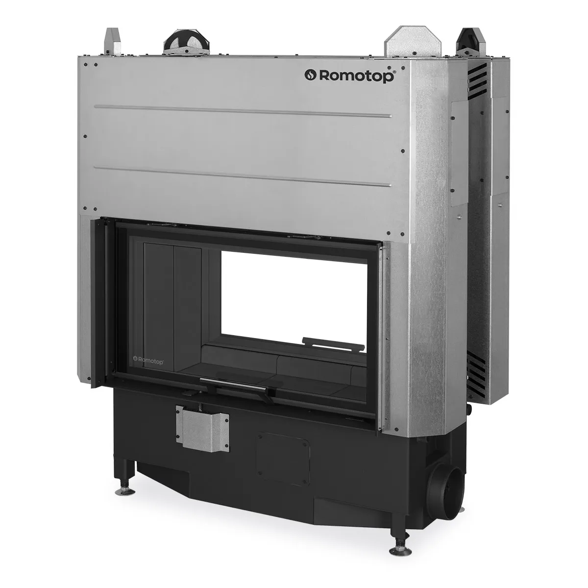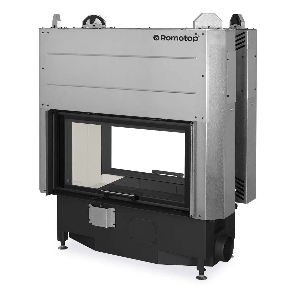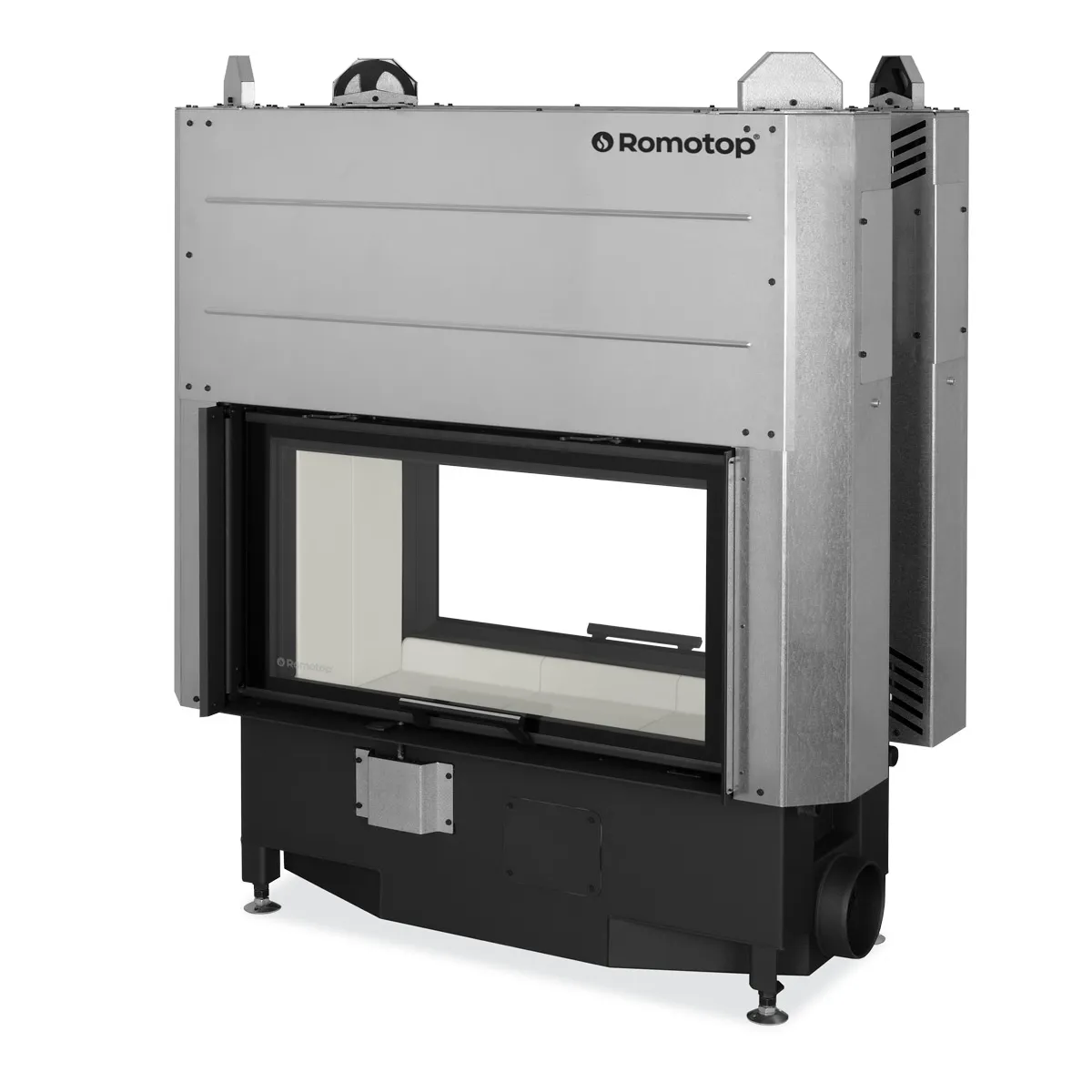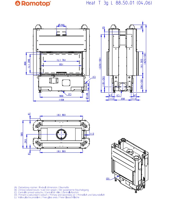 Kominek Heat T 3G L 88.50.04 to dwustronny, przeszkolony z dwóch stron, najnowszej generacji stalowy wkład kominkowy typu tunel z drzwiami otwieranymi do góry (tzw. gilotyna) od uznanego czeskiego producenta kominków Romotop.