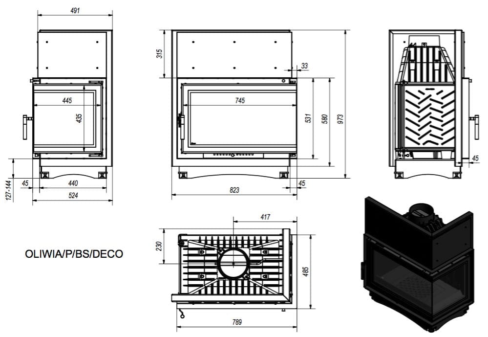 Wkład kominkowy OLIWIA 16 kW PRAWY BS DECO SZYBY ŁĄCZONE BEZ SZPROSA Szyba boczna dzielona - wkład kominkowy z dwoma szybami zestawionymi ze sobą pod kątem prostym.