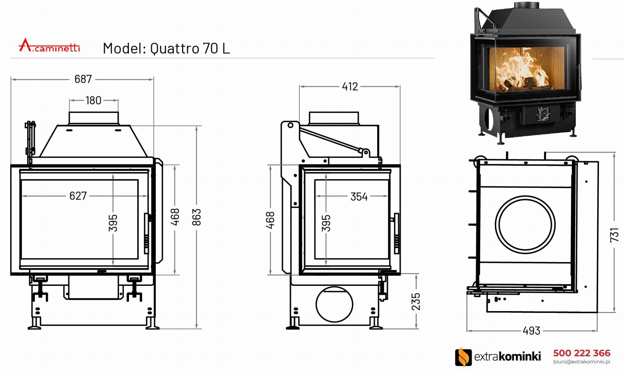 Kominek powietrzny stalowy Quattro 70 L lewy