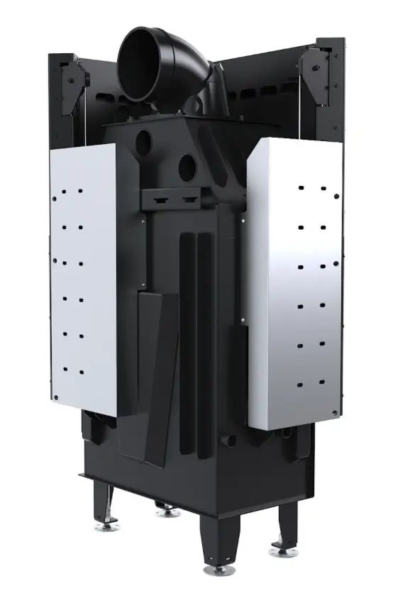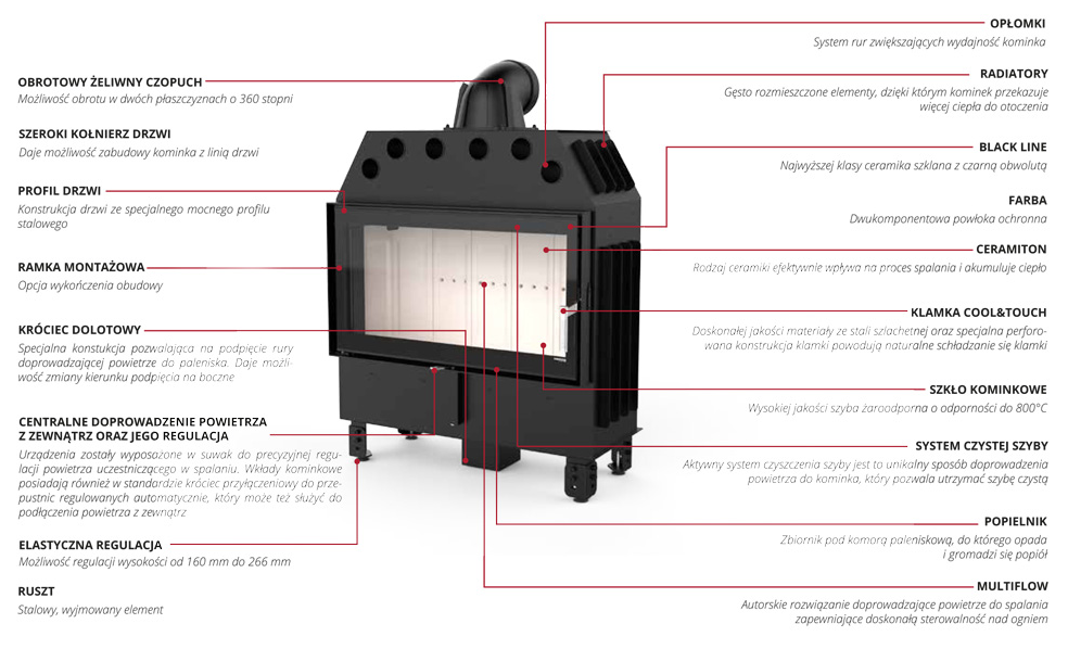Standardowo wkład Intra wyposażono w system czystej szyby, regulację dopływu powietrza wtórnego i pierwotnego jednym suwakiem oraz system dopalania spalin. Atutem jest perforowana klamka, która się nie nagrzewa. Palenisko zostało wyłożone wytrzymałymi kształtkami z żarobetonu (ceramika+beton).