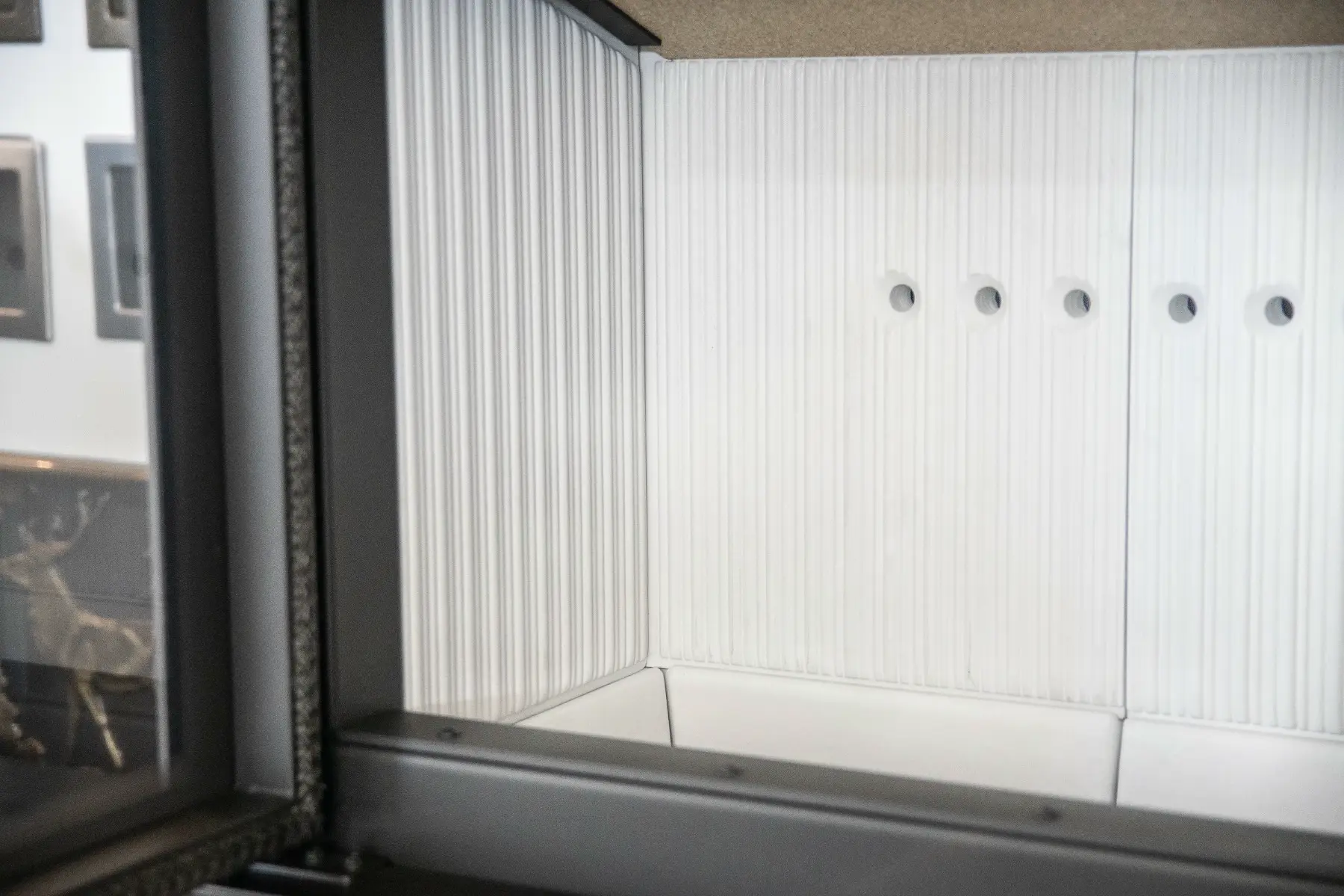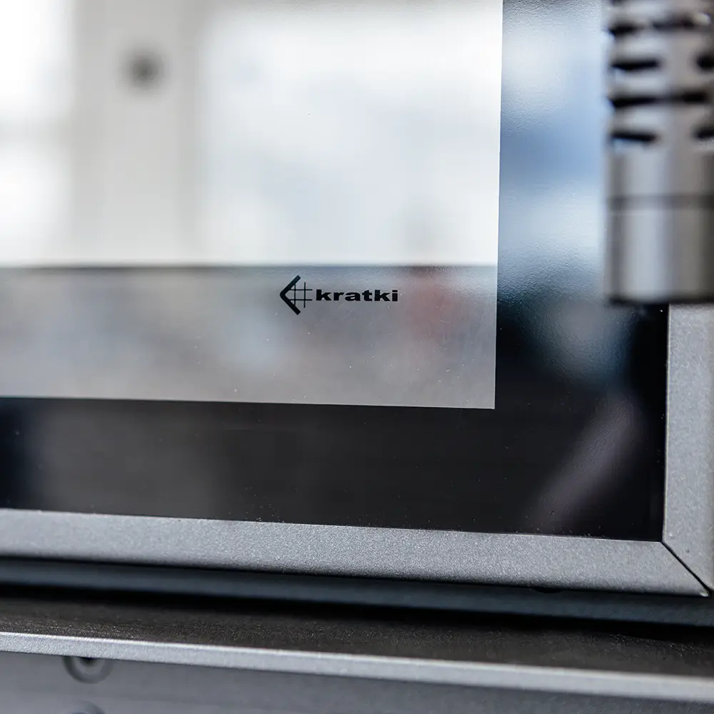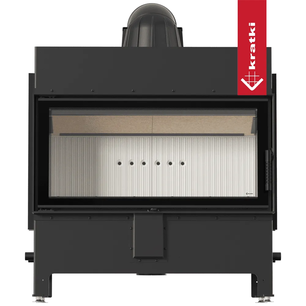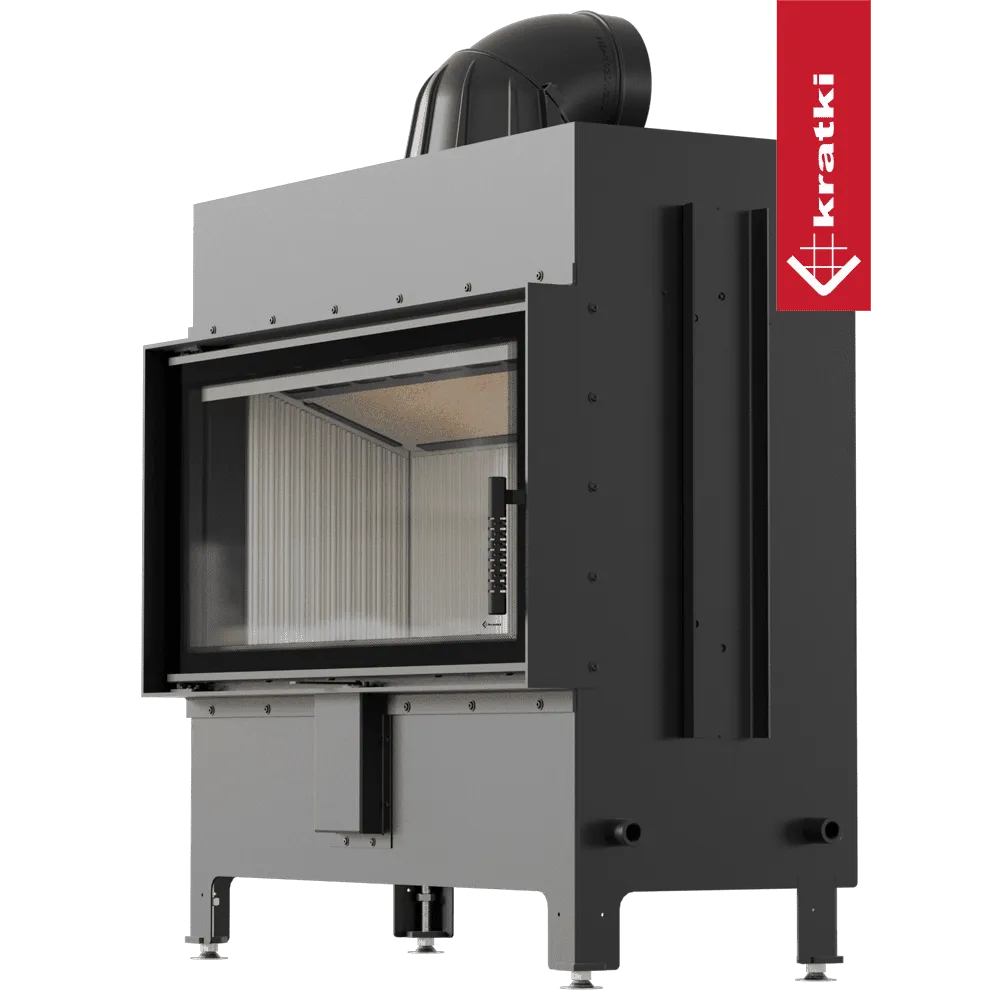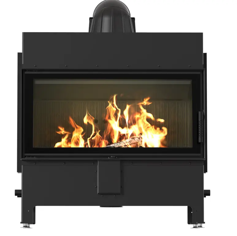 Dekoracyjna szyba typu glass wytrzymująca temperaturę do 800oC, która nadaje kominkowi nowoczesny i elegancki wygląd, optycznie powiększa front wkładu. Elegancka i wygodna klamka.