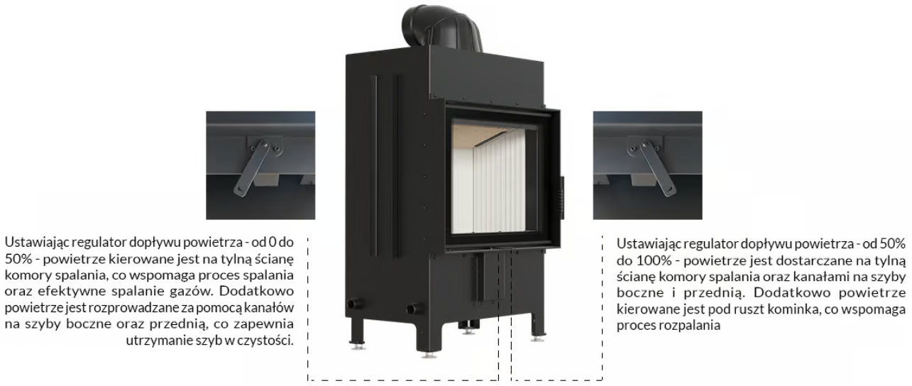 Dostarczanie powietrza wyłącznie z zewnątrz dzięki wbudowanemu króćcowi dolotu powietrza fi 125 mm. Regulacja dolotu powietrza za pomocą jednego regulatora, co wyklucza błędy w niewłaściwym użytkowaniu.