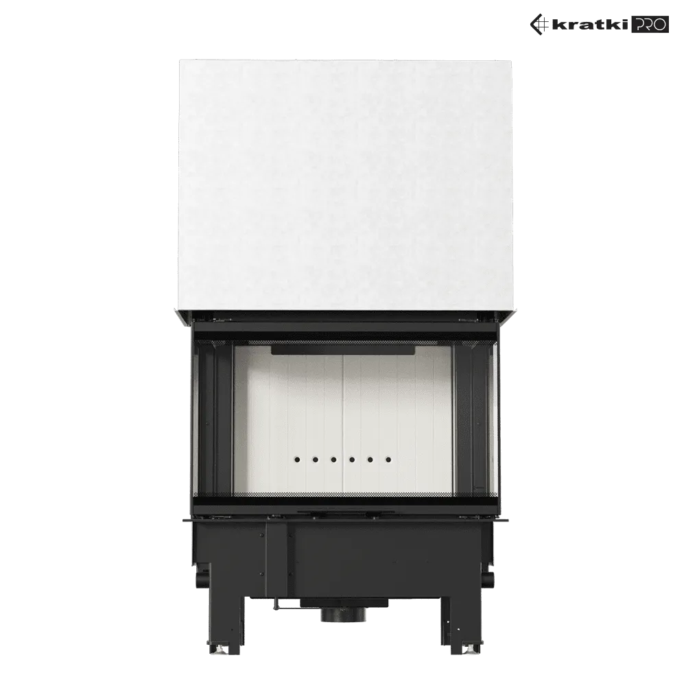 Nowoczesny kominek stalowy powietrzny Regnor o mocy 8 kw, z trójstronnym przeszkleniem i drzwiami otwieranymi do góry tzw. gilotyna.