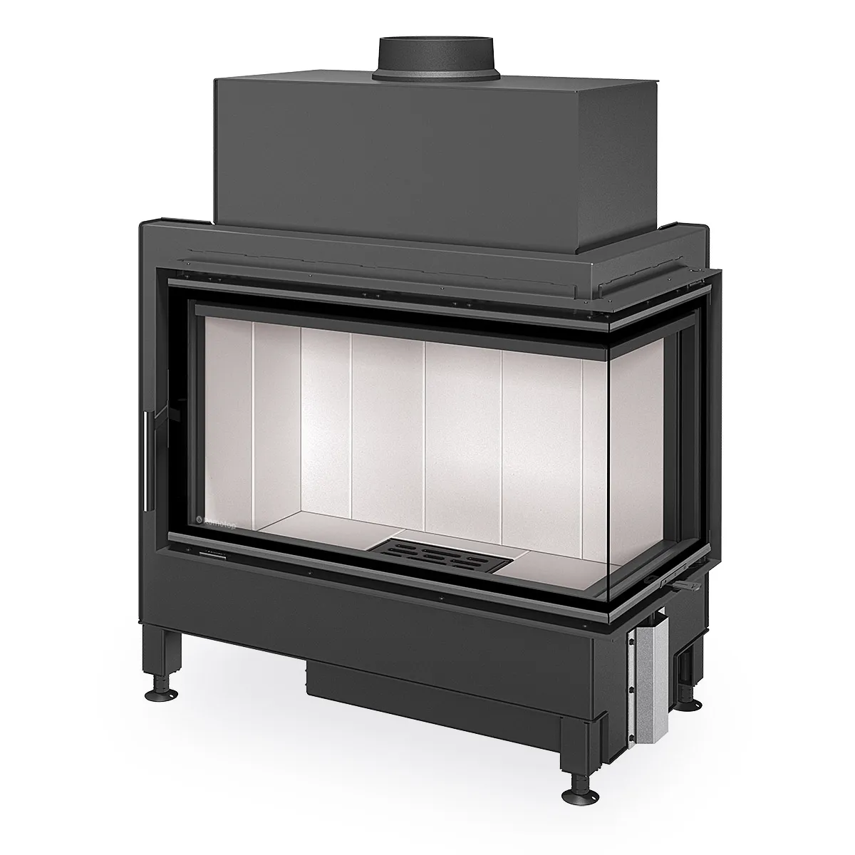 Wysokiej klasy konwekcyjny wkład kominkowy Romotop Heat R 4G S 81.51.40.21 z szybą narożną i centralnym doprowadzeniem powietrza.