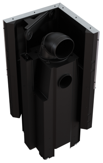 Dostarczanie powietrza pierwotnego do wkładu odbywa się z zewnątrz, dzięki wbudowanemu króćcowi dolotu powietrza fi 125 mm. Króciec dolotu powietrza znajduje się w podłodze wkładu. Jego regulacja odbywa się za pomocą wbudowanej przepustnicy ustawianej jednym regulatorem znajdującą się poniżej drzwiczek, co wyklucza błędy w niewłaściwym użytkowaniu. Cały mechanizm działa wewnątrz kominka, bardzo cicho i bezawaryjnie.
