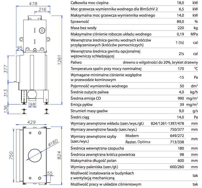 Kominek Nemo 2 Topeco ogrzewa do 180 m2. Do układu wodnego (C.O) oddawana jest moc 14 kW. Ciepło o wartości 4 kW oddawane jest przez szybę i korpus kominka.