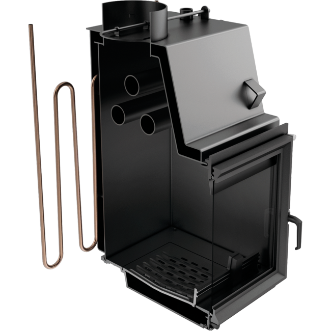 Kominek z płaszczem wodnym Zuzia Prawy BS 12 kW Deco ogrzewa do 120 m2. Do układu wodnego (C.O) oddawana jest moc 8 kW. Ciepło o wartości 4 kW oddawane jest przez szybę i korpus kominka. Kominek ma wbudowaną wężownicę schładzającą oraz szyber regulujący wylot spalin. W palenisku znajduje się ruszt i popielnik.