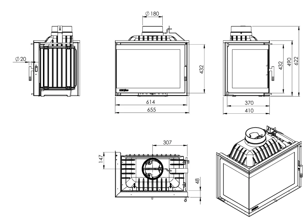 Wyjście spalin ma średnicę 180 mm i znajduje się na górze kominka