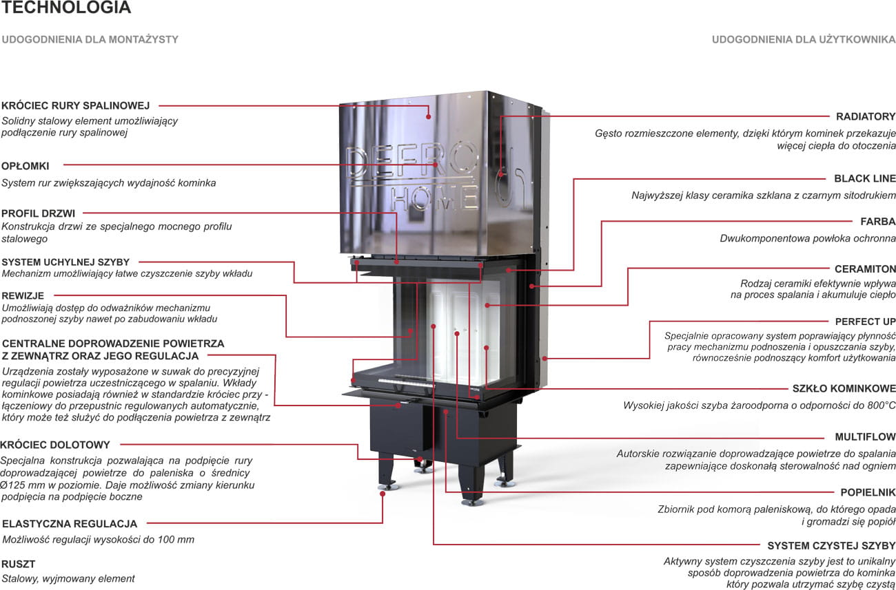 Seria wkładów z podnoszonym przeszkleniem Perfect Up, idealnie wpisuje się w nowoczesną stylistykę. Dzięki dużej szybie i wykończeniu Black Line doskonale pasuje do otwartych pomieszczeń. Wkłady kominkowe z serii INTRA G, z powodzeniem ogrzeją cały dom. Nowoczesna konstrukcja i szczelne palenisko pozwala na cieszenie się jego możliwościami w domach pasywnych oraz z rekuperacją. Autorskie rozwiązania gwarantują oszczędność energii i bezawaryjną obsługę urządzenia.