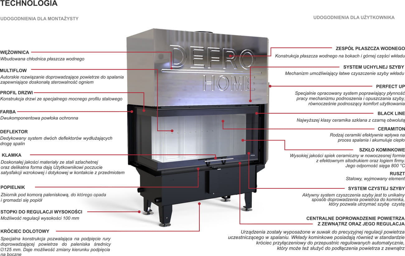 Standardowo wkład wyposażono w system czystej szyby, regulację dopływu powietrza wtórnego i pierwotnego jednym suwakiem oraz system dopalania spalin. Atutem jest perforowana klamka, która się nie nagrzewa. Palenisko zostało wyłożone wytrzymałymi kształtkami z żarobetonu (ceramika+beton).