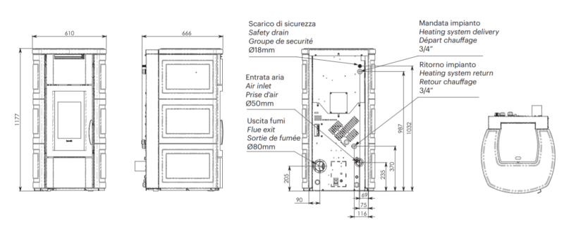 Kominek jest przystosowany do pracy w układzie zamkniętym, posiada wbudowaną pompę obiegową, naczynie przeponowe oraz zawór bezpieczeństwa. Piecyk został wyposażony w wentylator frontowy ciepłego powietrza z niezależną regulację oraz możliwość całkowitego wyłączenia.