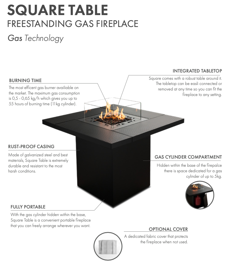 Ogrzewacz tarasowy Square ma wbudowaną komorę na butlę gazową (mieści się mała butla), co zapewnia łatwą i szybką wymianę po jej zużyciu. Biokominek posiada dopasowany pokrowiec, który chroni gazowy ogrzewacz, w czasie gdy nie jest używany. Wymontowanie szklanych części i okapu znaczniej zmniejsza gabaryty kominka, co ułatwia jego przechowywanie.