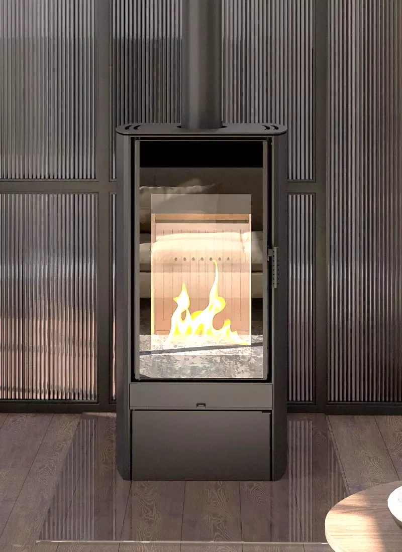 Piec na drewno RECTAN F3 to koza o delikatnej bryle z wysoką szybą, która zapewnia piękną wizję ognia. Piece kominkowe RECTAN oferowane są w trzech formach: F1 podparty na subtelnej nodze, F2 z wnęką na drewno, F3 z zamkniętą drzwiczkami bryłą.