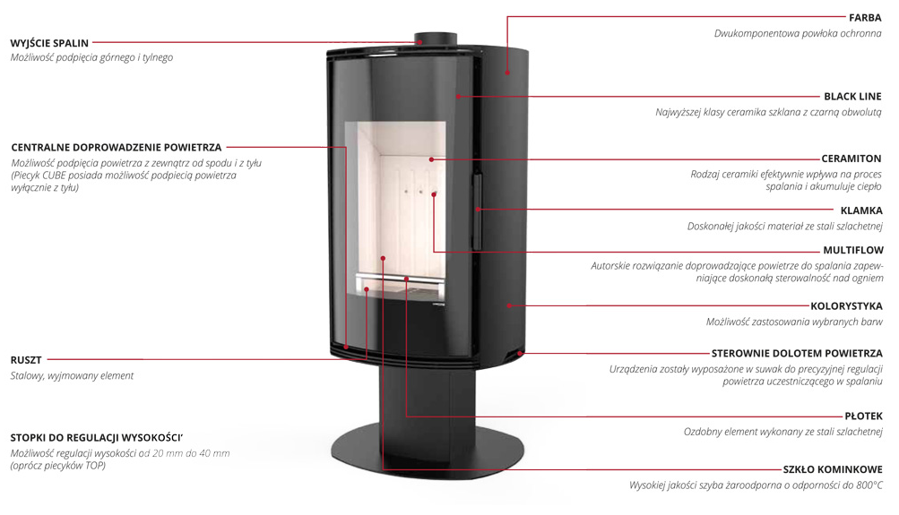 Piecyk wyposażony jest we wnękę do magazynowania drewna, która w idealny sposób współgra z charakterem CUBE. Możliwość doprowadzenia powietrza do paleniska z tyłu pieca. Możliwość wypoziomowania pieca od 20 mm do 40 mm.