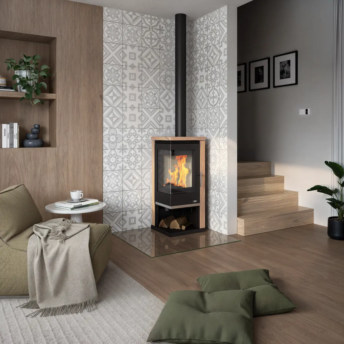 Admiral to narożny piec kominkowy wykonany został ze stali i kamienia.