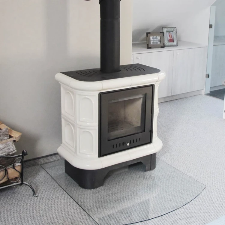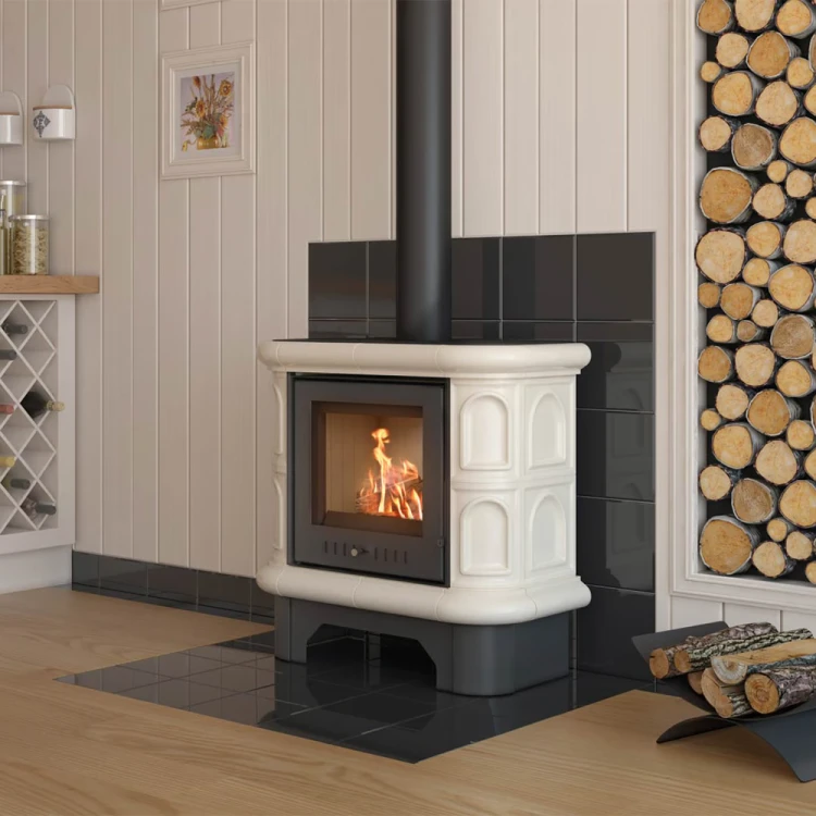 Wzornictwo nawiązujące do stylu retro - kafle z połyskiem. Obudowa wykonana z kafli wpływa na wydłużenie czasu oddawania ciepła, co stanowi dodatkowe źródło ogrzewania po wygaszeniu paleniska.