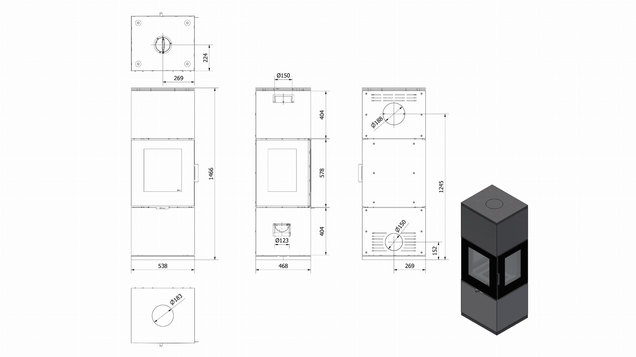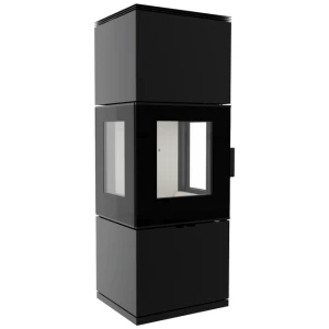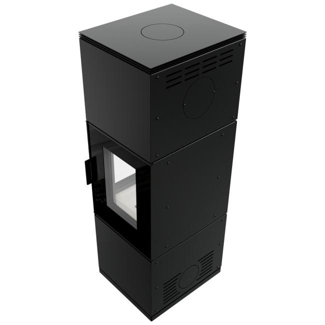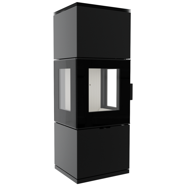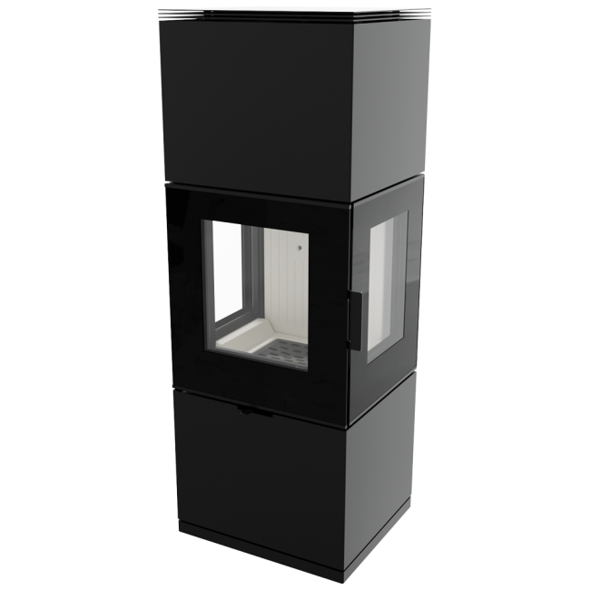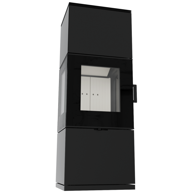 Przestronne przeszklenie uatrakcyjnia wizję ognia, a dodatkowa ozdobna szyba typu glass podkreśla jego urok. Wnętrze pieca wyłożone TERMOTEC doskonale kontrastuje z bryłą, nadając całości nowoczesnego wyglądu. Solidna klamka, ułatwia szczelne zamknięcie drzwiczek. Dzięki temu urządzenie doskonale sprawdzi się w domach z rekuperacją.