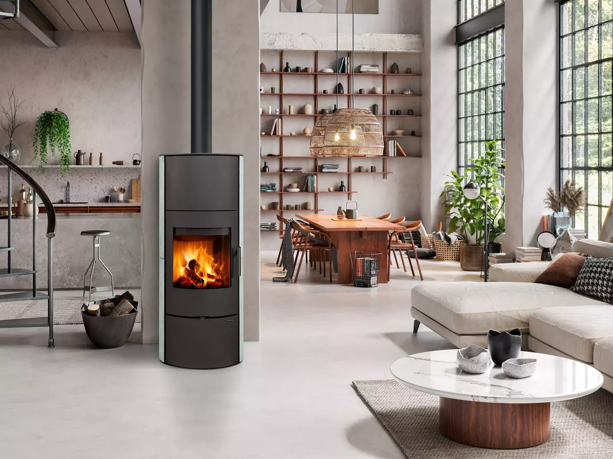 Evora H kamień to nowoczesny stalowy piec kominkowy o mocy nominalnej 5,1 kW z obudową z naturalnego kamienia i możliwością wzmocnienia kominka o zestaw akumulacyjny.