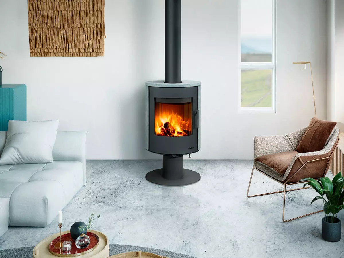Evora T kamień to nowoczesny, stalowy piec na nodze, z obrotowym paleniskiem i obudową z naturalnego kamienia.
