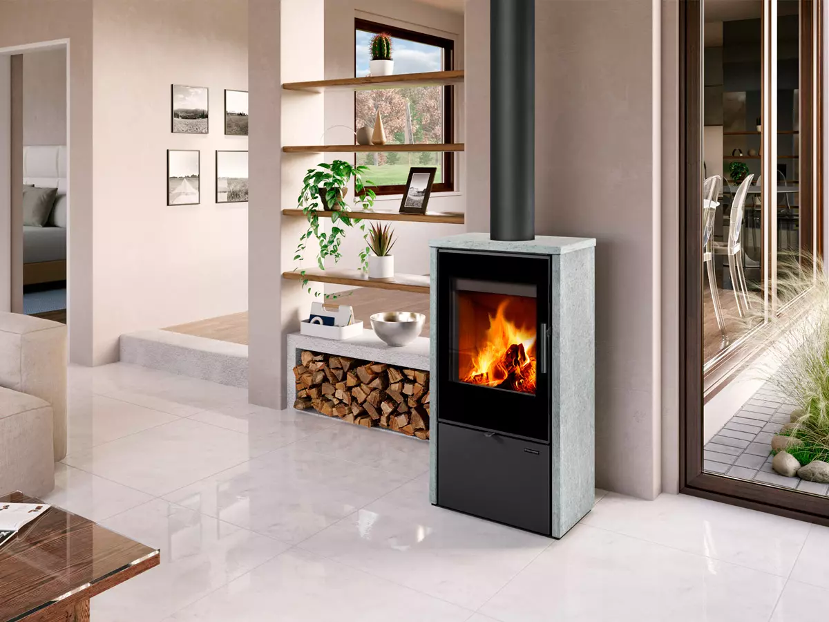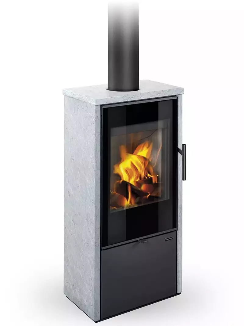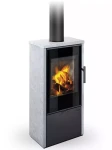 Laredo F Kamień to nowoczesny stalowy piec kominkowy o mocy nominalnej 5,1 kW z obudową z naturalnego kamienia.