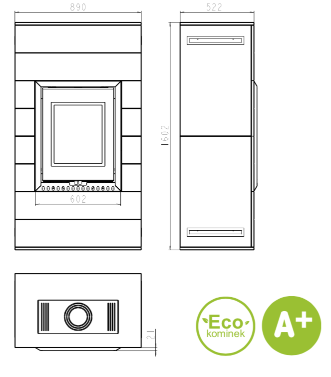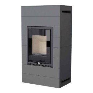 Wykonany z blachy kotłowej pomalowanej proszkowo na czarno. Pionowa rama drzwi z prostą szybą. Palenisko o małej rurze dymowej, tylko fi 150. Z genialnym widokiem ognia oraz pełną regulacją płomienia tylko jednym cięgnem.