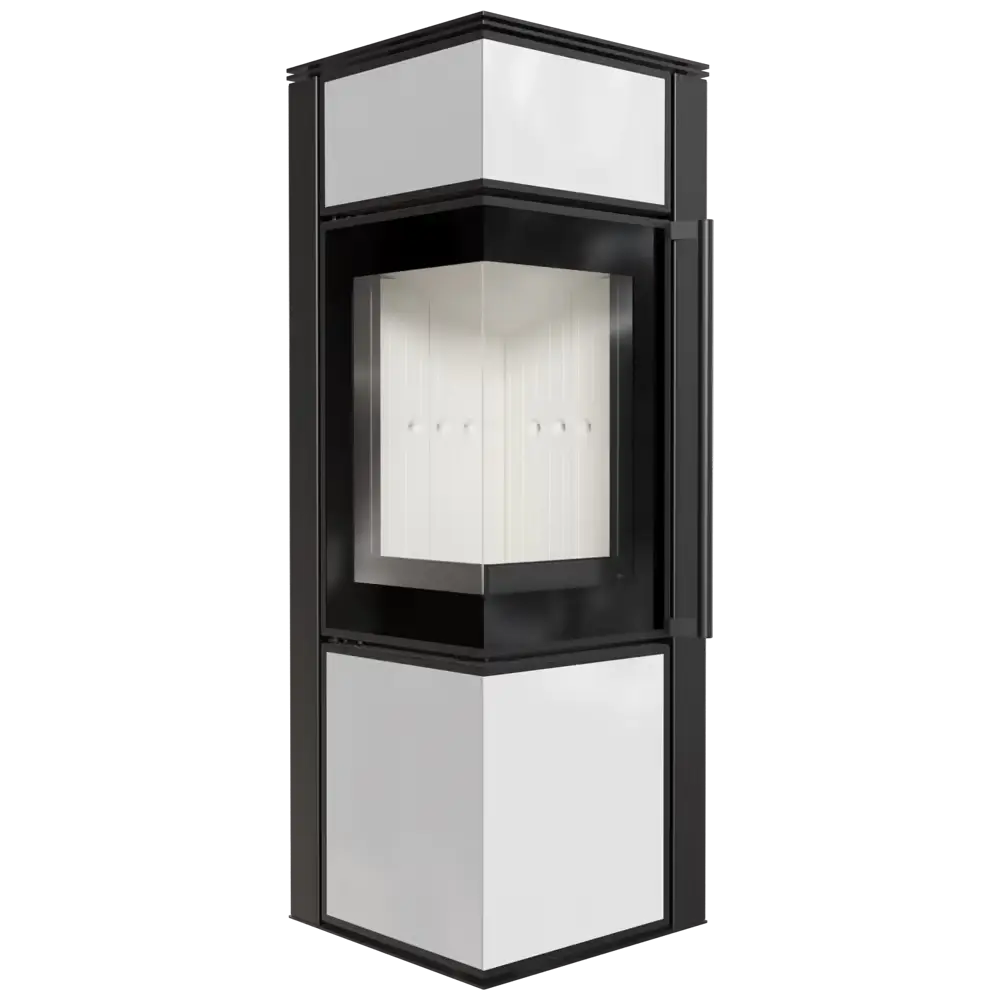 Piec TORA w rozmiarze S to piec stalowy wykończony płytami ze spieku kwarcowego lub panelami szklanymi. Wyposażony w narożne drzwi ozdobione czernionym przeszkleniem, dla pogłębienia wizji ognia.