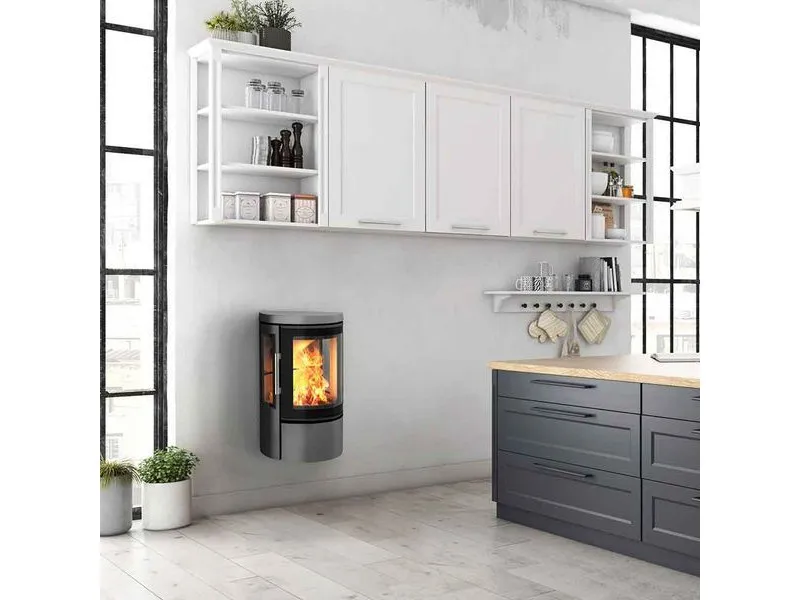 Hwam 2610c to duńskiej produkcji piec kominkowy na drewno, podwieszany na ścianie, trzyszybowy, o mocy 4,5 kW do ogrzewania małych pomieszczeń.