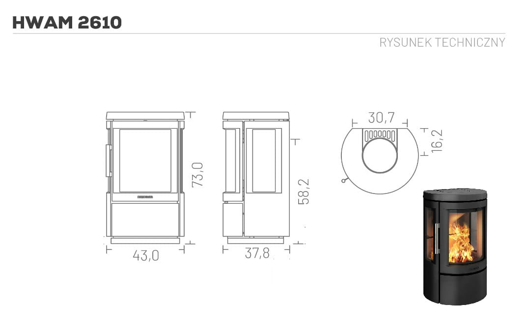 Rysunek techniczny pieca wiszącego Hwam 2610 c z autopilotem