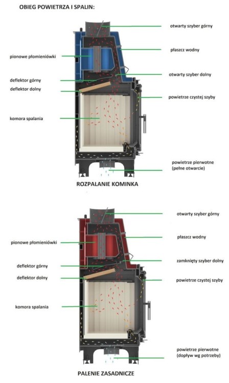 Dwuszybrowa regulacja wylotu spalin: szyber górny, który pozwala na regulację ciągu komina; szyber dolny, pozwala na regulację ciągu komina, przełączający wkład ze stanu rozpalania w stan pracy. System dopowietrzenia komory paleniska, realizowany jest wyłącznie z zewnątrz poprzez dostarczenie powietrza pierwotnego i wtórnego do komory spalania. W standardzie wkład posiada dolot powietrza o średnicy fi 125 mm, który umożliwia doprowadzenie świeżego powietrza do paleniska z zewnątrz budynku. Rozdzielenie powietrza odbywa się w przestrzenie poniżej płyty dolnej paleniska. Powietrze dostarczane jest kanałem znajdującym się na wysokości płyty dolnej do płotka, wyposażonego na całej długości w system otworów. Przyczynia się to do poprawy warunków spalania wsadu. Spalanie odbywa się równomiernie na całej szerokości paleniska. Regulacja intensywności spalania we wkładzie odbywa się za pomocą mechanizmu znajdującego się poniżej drzwi wkładu.