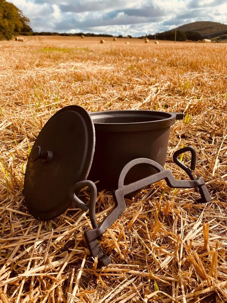 Kociołek myśliwski o pojemności 8 litrów, wyprodukowany z wysokiej jakości żeliwa w Polsce, starannie wykończony i wypalany w wysokiej temperaturze, co ma wpływ na jego odporność i czynniki klimatyczne.