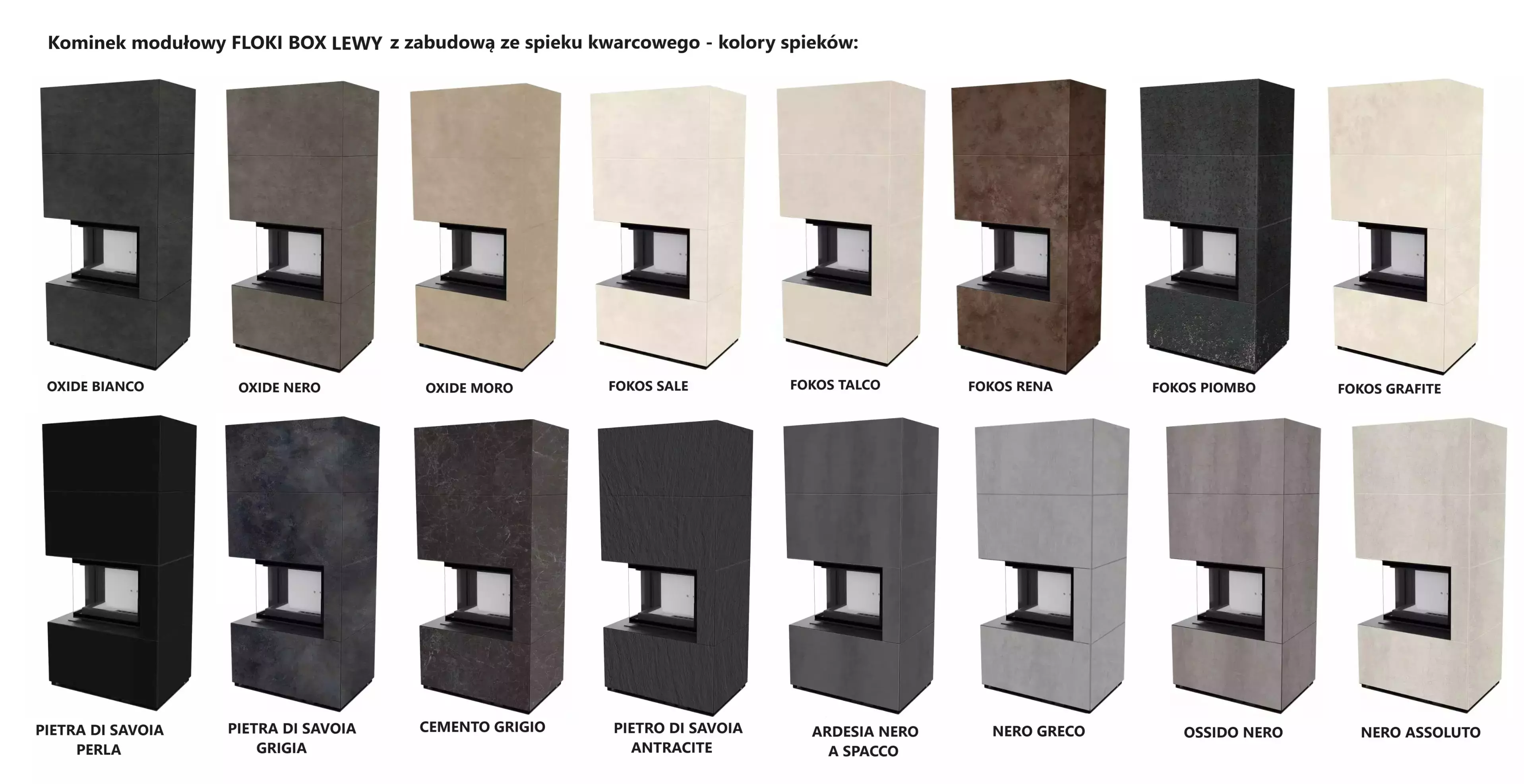 Kominek modułowy FLOKI BOX LEWY 8 kW fi 160 zabudową ze spieku kwarcowego w szesnastu pięknych kolorach i strukturach