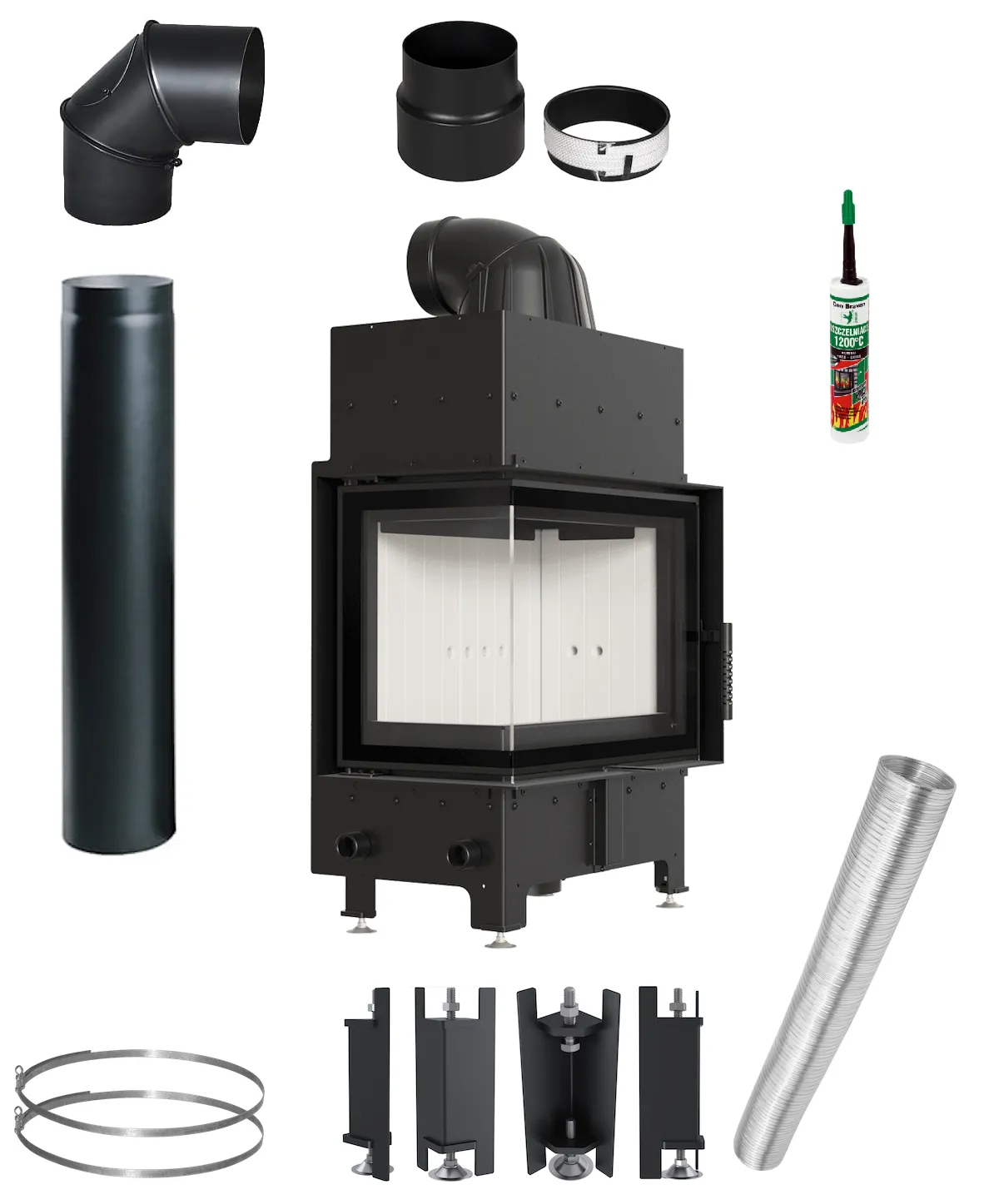 Zestaw składający się z wkładu stalowego Floki S Lewy oraz elementów niezbędnych pod podłączenia do dolotu powietrza z zewnątrz i do komina ceramicznego o średnicy 200 mm