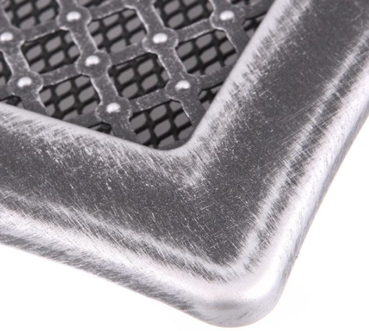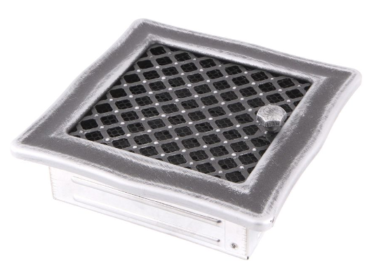 Kratka kominkowa stylowa z żaluzją 16x16cm - kolor: srebrna patyna. Kratka kominkowa stylowa – przeznaczona do nawiewu ciepłego powietrza w sposób grawitacyjny lub wymuszony, a także do wywiewu powietrza wentylacyjnego. Wykonana jest z elementów stalowych odpowiednio przygotowanych w procesie technologicznym. Kratkę kominkową montuje się w czopuchach kominków lub w ścianach. Produkowana w rozmiarach standardowych kafli kominkowych. Kratka posiada uchylne drzwiczki. Kratki z żaluzją nie należy montować w czopuchach kominków.