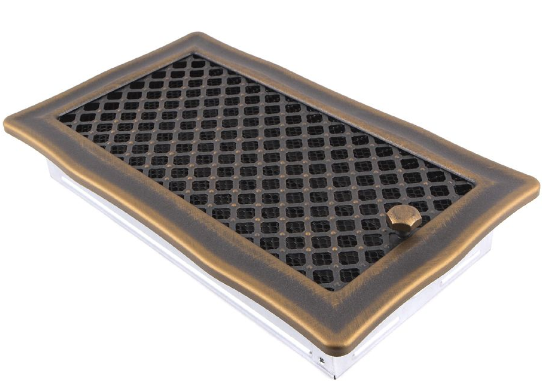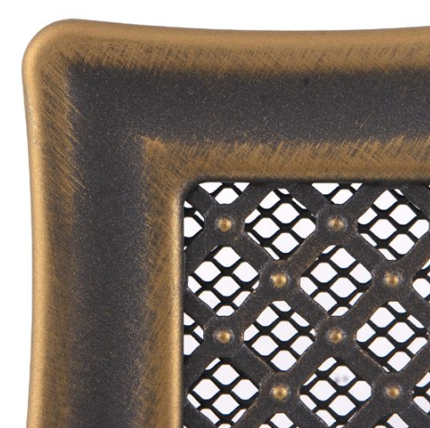 Kratka kominkowa stylowa z żaluzją 16x32cm - kolor: złota patyna. Kratka kominkowa stylowa – przeznaczona do nawiewu ciepłego powietrza w sposób grawitacyjny lub wymuszony, a także do wywiewu powietrza wentylacyjnego. Wykonana jest z elementów stalowych odpowiednio przygotowanych w procesie technologicznym. Kratkę kominkową montuje się w czopuchach kominków lub w ścianach. Produkowana w rozmiarach standardowych kafli kominkowych. Kratka posiada uchylne drzwiczki. Kratki z żaluzją nie należy montować w czopuchach kominków.