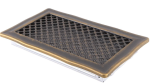 Kratka kominkowa stylowa 16x32cm - kolor: złota patyna. Kratka kominkowa stylowa – przeznaczona do nawiewu ciepłego powietrza w sposób grawitacyjny lub wymuszony, a także do wywiewu powietrza wentylacyjnego. Wykonana jest z elementów stalowych odpowiednio przygotowanych w procesie technologicznym. Kratkę kominkową montuje się w czopuchach kominków lub w ścianach. Produkowana w rozmiarach standardowych kafli kominkowych. Kratka posiada uchylne drzwiczki. Kratki z żaluzją nie należy montować w czopuchach kominków.