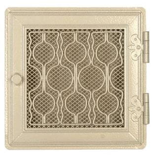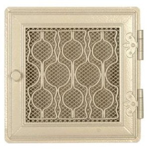 Kratka kominkowa stylowa 21x21cm - kolor: biały antyk. Kratka kominkowa stylowa – przeznaczona do nawiewu ciepłego powietrza w sposób grawitacyjny lub wymuszony, a także do wywiewu powietrza wentylacyjnego. Wykonana jest z elementów stalowych odpowiednio przygotowanych w procesie technologicznym. Kratkę kominkową montuje się w czopuchach kominków lub w ścianach. Produkowana w rozmiarach standardowych kafli kominkowych. Kratka posiada uchylne drzwiczki. Kratki z żaluzją nie należy montować w czopuchach kominków.