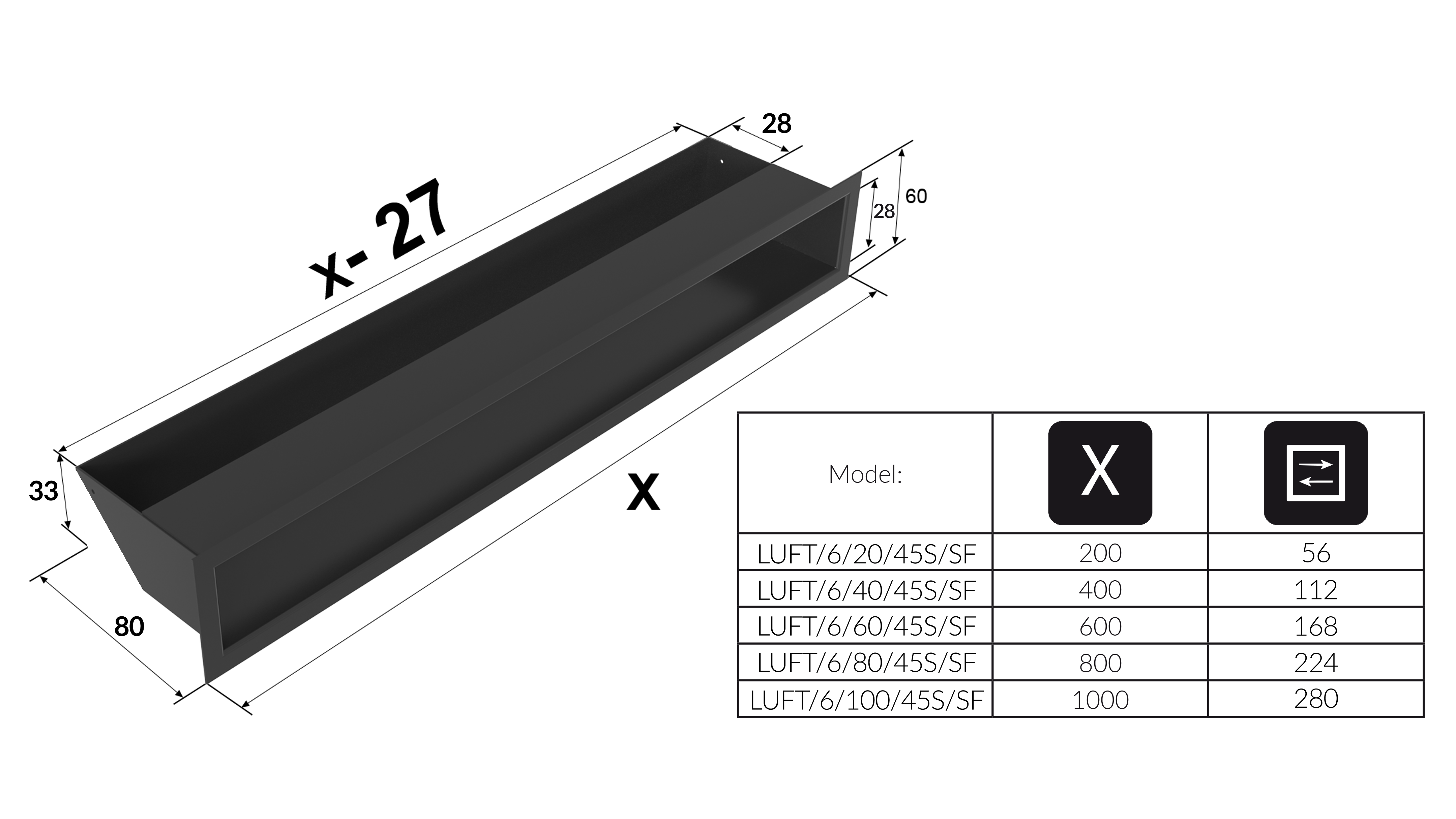 Kratka kominkowa Luft SF 6x60 stanowi estetyczne zakończenie kanałów rozprowadzających ciepłe powietrze z kominka. Jest ona instalowana w ścianie lub w czopuchu obudowy kominkowej. Kratka wyróżnia się nowoczesnym i minimalistycznym wyglądem, a jej podłużna forma sprawia, że doskonale sprawdza się we wnętrzach utrzymanych w stylu współczesnym. Charakterystyczną cechą modelu LUFT jest zamaskowany wlot powietrza. Przy montażu kratki należy pamiętać o jej prawidłowym ułożeniu. Jeżeli instalujemy ją nad kominkiem - wlot powietrza powinien znajdować się na spodzie, jeżeli pod wkładem - wlot powinien być na górze. Pozwoli to zachować odpowiedni, konwekcyjny przepływ ogrzewanego powietrza. Dzięki malowaniu kratki metodą proszkową, jej kolor pozostaje trwały i odporny na działanie podwyższonej temperatury, a sama kratka jest bardziej odporna na uszkodzenia mechaniczne. Gwarancja 24 miesiące.