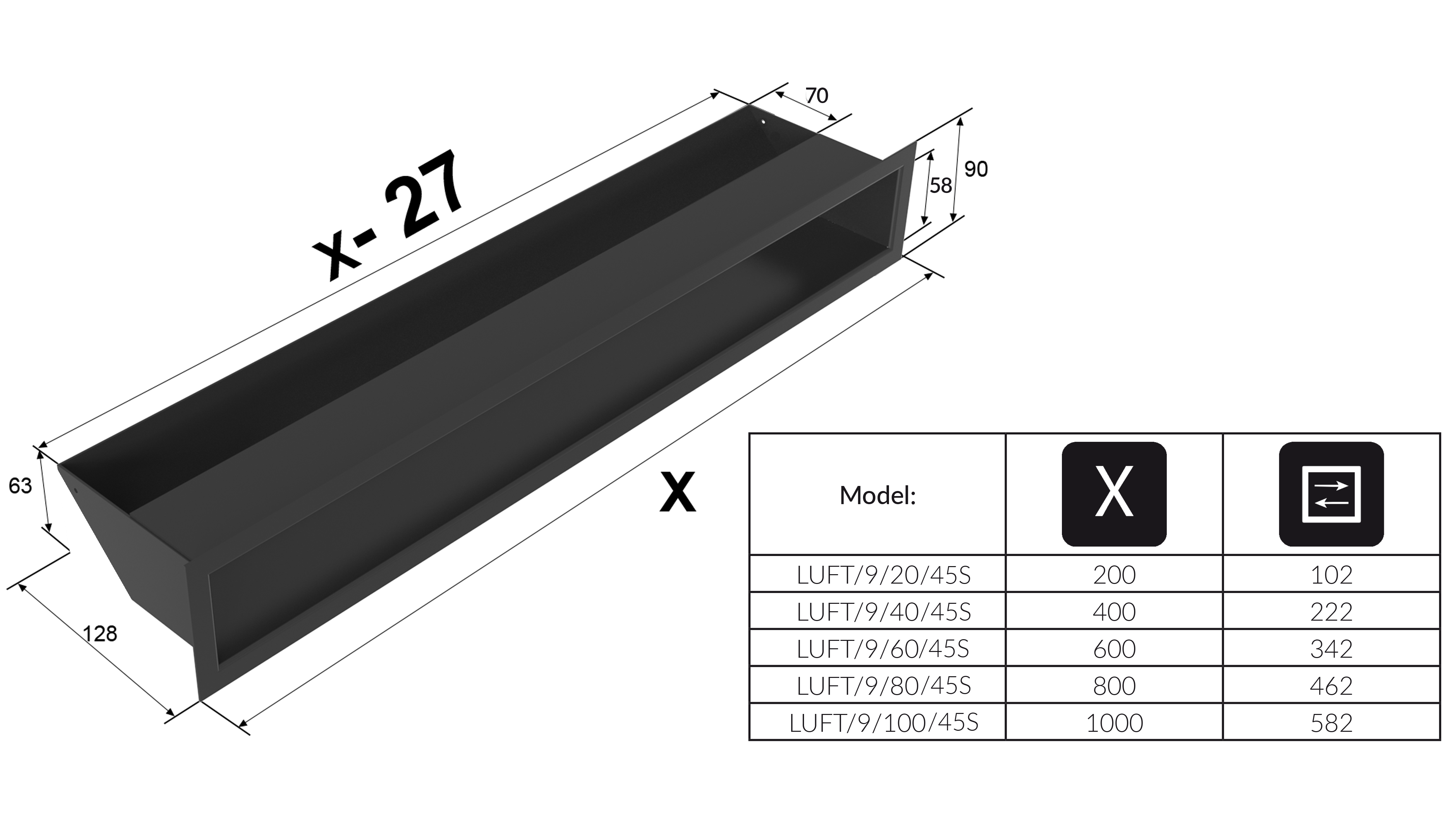 LUFT 45S są: zamaskowany wlot powietrza – wykonany pod kątem 45 stopni oraz front bez widocznych łączeń. Przy montażu kratki należy pamiętać o jej prawidłowym ułożeniu. Jeżeli instalujemy ją nad kominkiem - wlot powietrza powinien znajdować się na spodzie, jeżeli pod wkładem - wlot powinien być na górze. Pozwoli to zachować odpowiedni, konwekcyjny przepływ ogrzewanego powietrza.