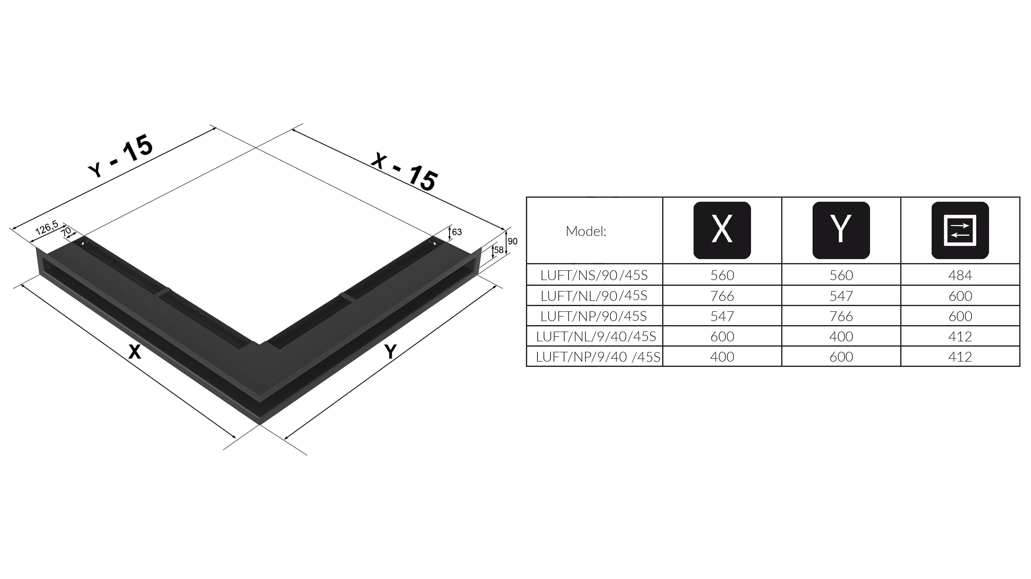 LUFT 45S są: zamaskowany wlot powietrza – wykonany pod kątem 45 stopni oraz front bez widocznych łączeń. Przy montażu kratki należy pamiętać o jej prawidłowym ułożeniu. Jeżeli instalujemy ją nad kominkiem - wlot powietrza powinien znajdować się na spodzie, jeżeli pod wkładem - wlot powinien być na górze. Pozwoli to zachować odpowiedni, konwekcyjny przepływ ogrzewanego powietrza.