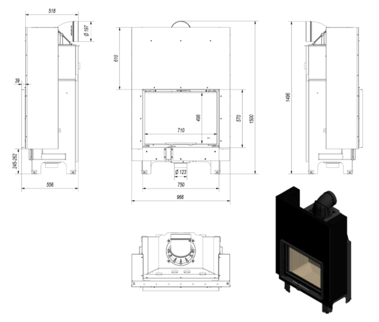 Wkład bezrusztowy - dopalanie na popiele, co oznacza, że opał wypala się na drobny popiół, którego pozostaje minimalna ilość. Uzyskana w ten sposób energia cieplna z drewna zostaje maksymalnie wykorzystana. Płyta dolna wkładu znacznie obniżona w stosunku do drzwi.