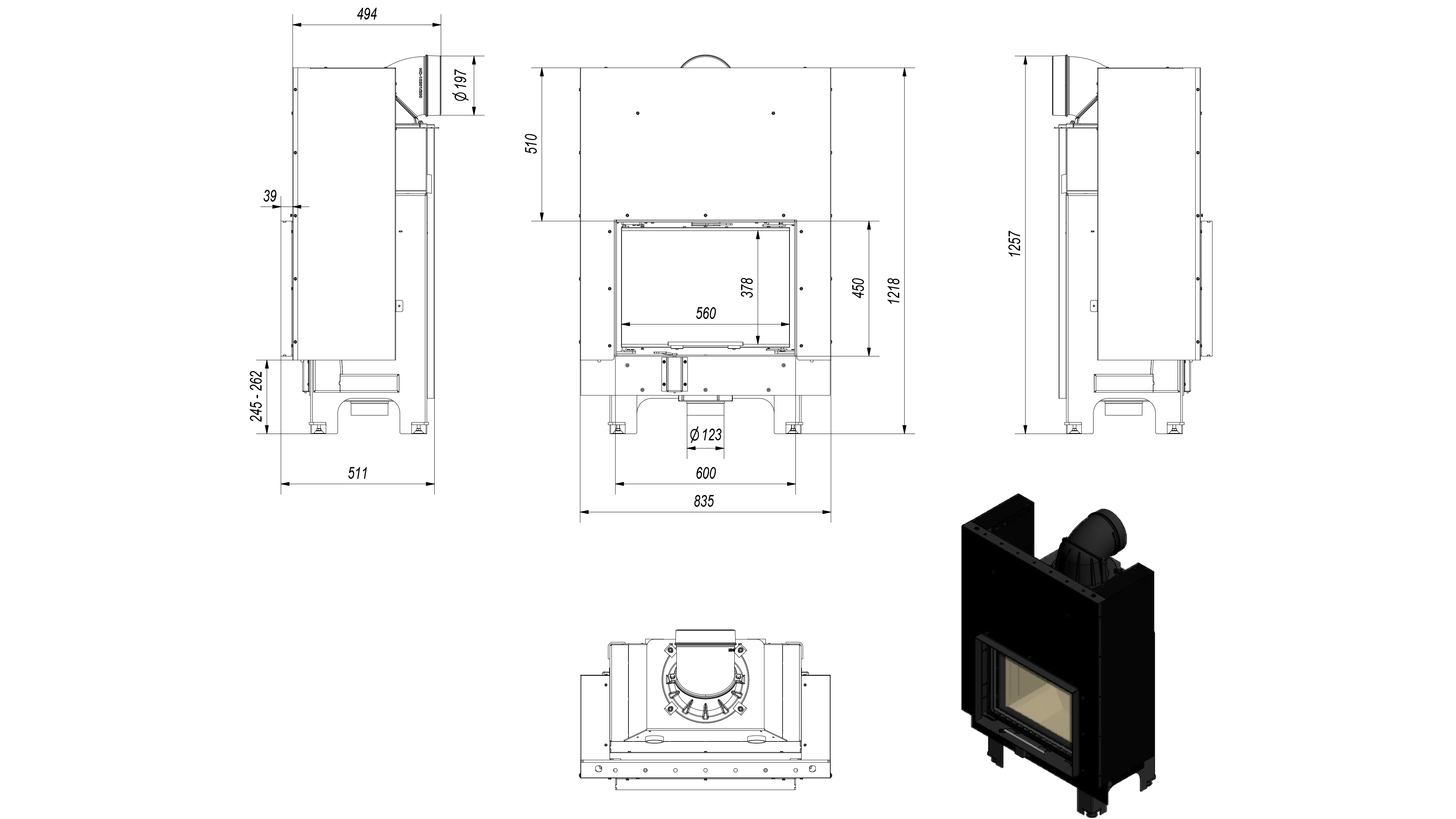 Wkład bezrusztowy - dopalanie na popiele, co oznacza, że opał wypala się na drobny popiół, którego pozostaje minimalna ilość. Uzyskana w ten sposób energia cieplna z drewna zostaje maksymalnie wykorzystana. Płyta dolna wkładu znacznie obniżona w stosunku do drzwi.