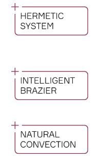 Budowa piecyka jest wykonana w nowej technologii: hermetyczna komora paleniska (nadaje się do instalacji w domach z wentylacją mechaniczną), mechaniczne czyszczenia dna paleniska, szczelne zamknięcie zasobnika na pellet, sonda pomiaru temperatury ognia.