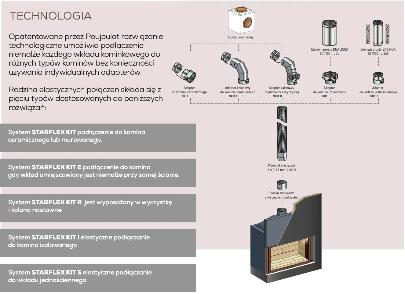 W przewodach dymowych w wyniku nieprawidłowego użytkowania może dojść do destrukcyjnego procesu jakim jest pożar sadzy (1000 °C). Wówczas tradycyjne podłączenia na skutek rozciągania się stali mogą uszkodzić obudowę komina lub komin ceramiczny, doprowadzając do nieszczelności przewodu kominowego. System STARFLEX KIT dzięki swej unikalnej budowie kompensuje rozciągalność stali jednocześnie oczyszczając się z sadzy. Chroni w ten sposób Twój kominek i komin ceramiczny przed uszkodzeniem. Stosowanie STARFLEX KIT daje gwarancję szczelności oraz bezpieczeństwo Twoje i Twojej rodziny. Opatentowane przez Poujoulat rozwiązanie technologiczne umożliwia podłączenie niemalże każdego wkładu kominkowego do różnych typów kominów bez konieczności używania indywidualnych adapterów.